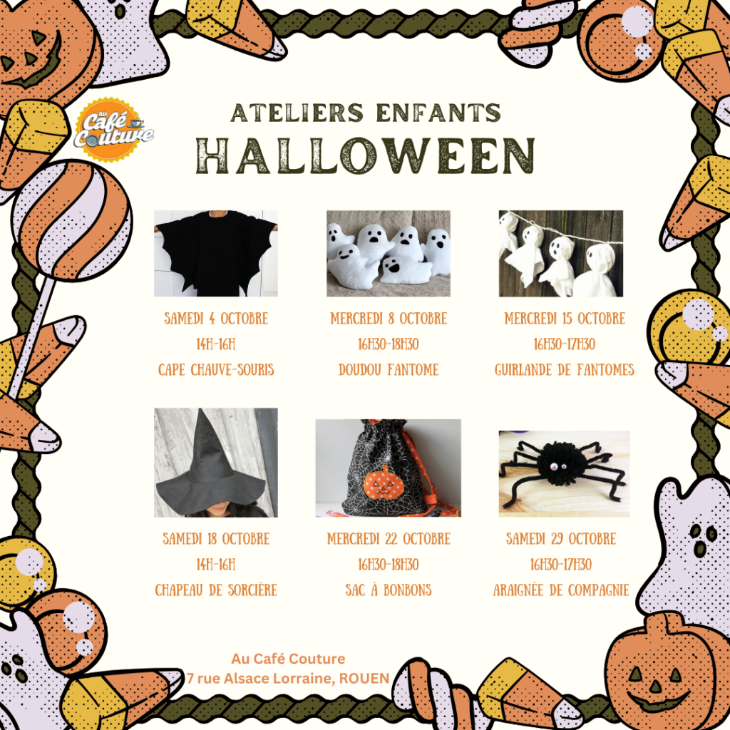 Halloween Approche !! Le Café Couture a donc prévu plusieurs ateliers enfants pour coudre son déguisement et fabriquer quelques décorations. Voici le programme : • Samedi 4 octobre de 14h à 16h : cape chauve-souris (30 € matériel et adhésion compris), • Mercredi 8 octobre de 16h30 à 18h30 : doudou fantôme (30 € matériel…